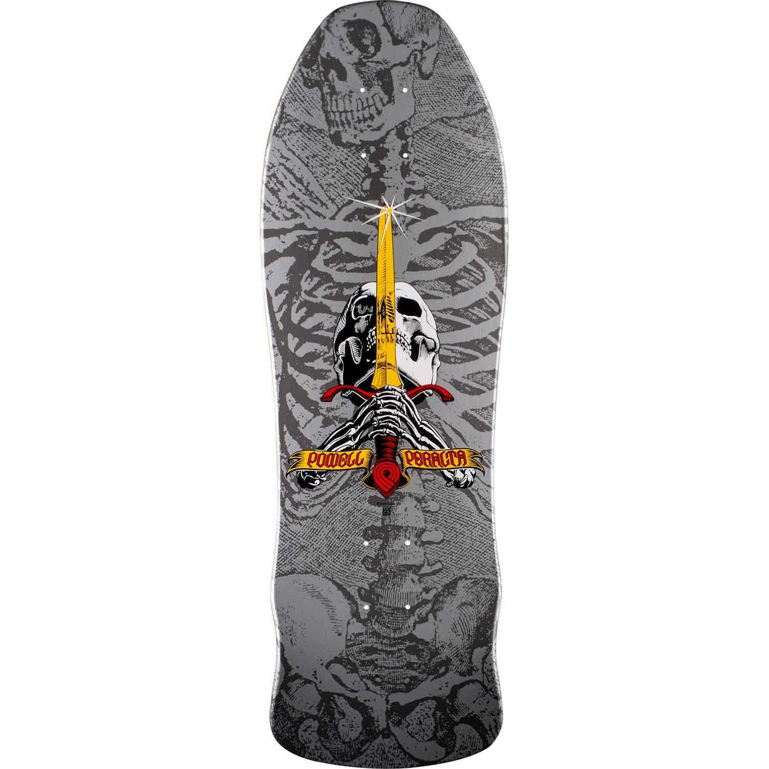In 1986 jump ramps were all the rage. Easy to build, portable and fun to launch off of. Unfortunately, decks were snapping left and right. Powell-Peralta deck returns were so high the company sought ways to make decks stronger and more resistant to jump breaks. One solution was Bonite construction. Another was the "Gee-Gaw" shape which had bumps to reinforce the break zone area. Why "Gee-Gaw?" Ask Chris Iverson. This shape was also used for the Skull & Sword graphic. They were originally produced between 1987 and 1988.