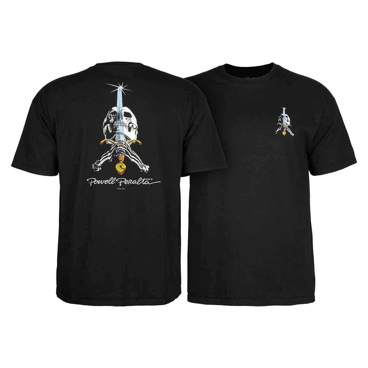 The Rodriguez "Skull & Sword" deck was the first professional signature deck graphic produced by Powell-Peralta. The graphic was conceived by Ray and illustrated by V.C. Johnson with artistic direction from George Powell in 1979.